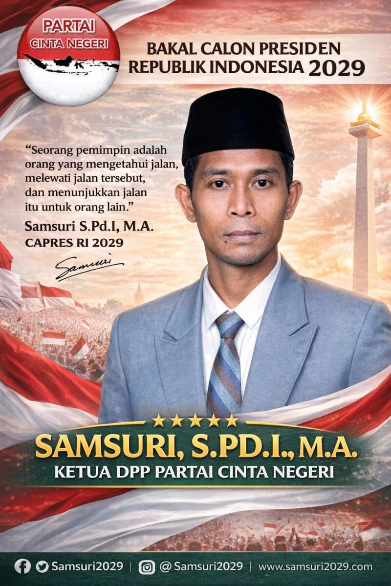 Jakarta | Sosok pendiri sekaligus Ketua Umum Partai Cinta Negeri, Samsuri, S.Pd.I, M.A, dideklarasikan sebagai Calon Presiden Republik Indonesia untuk Pemilihan Presiden (Pilpres) 2029 oleh Dewan Pimpinan Pusat Partai Cinta Negeri (DPP PCN). Deklarasi tersebut dibacakan oleh Ketua Bidang Litbang DPP Partai Cinta Negeri, Bapak Suwarno, pada hari Minggu, 27 April 2025, pukul 14.00 WIB hingga selesai.